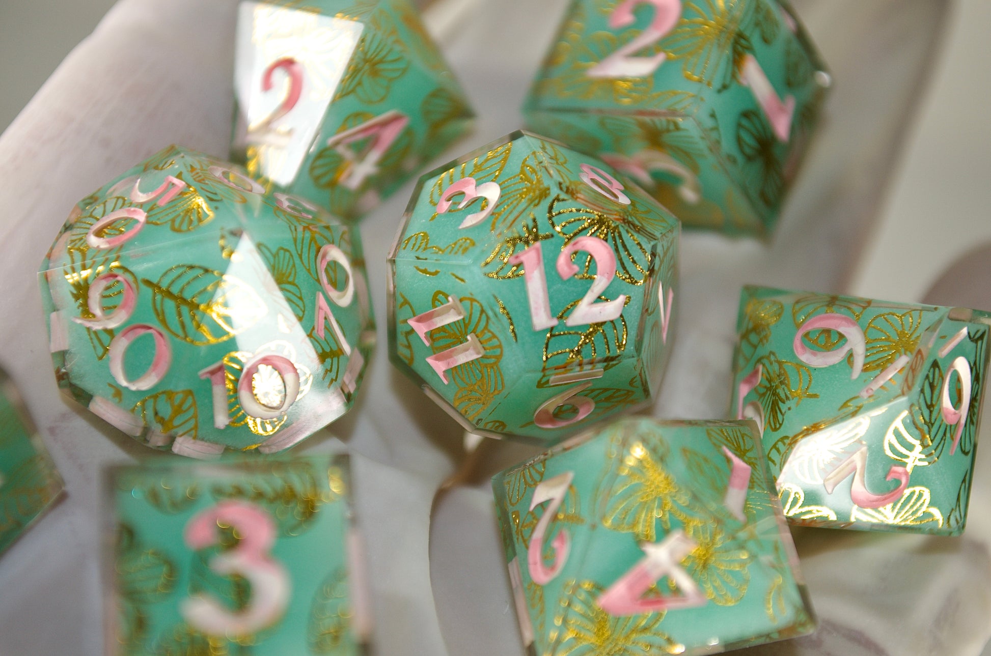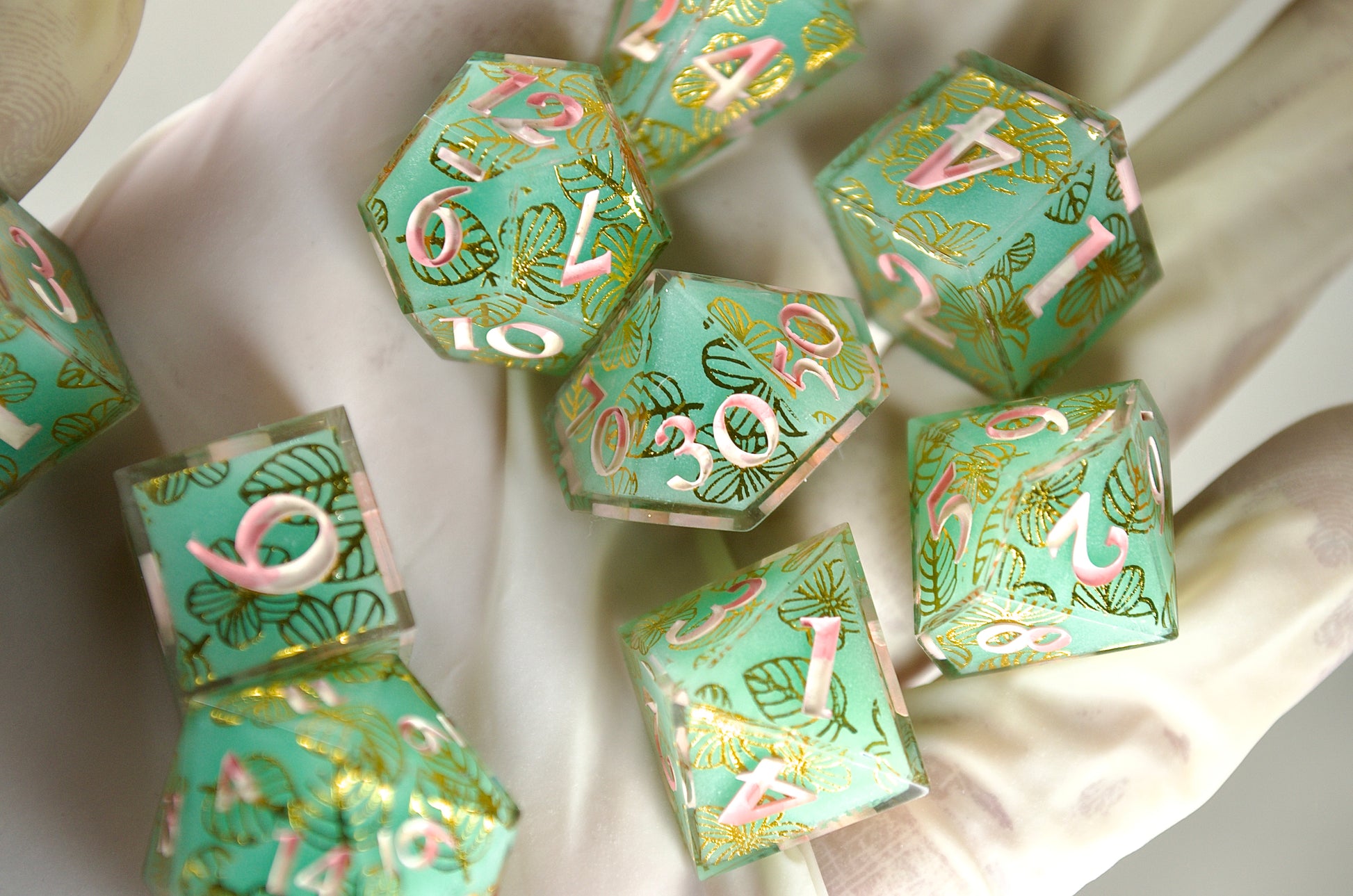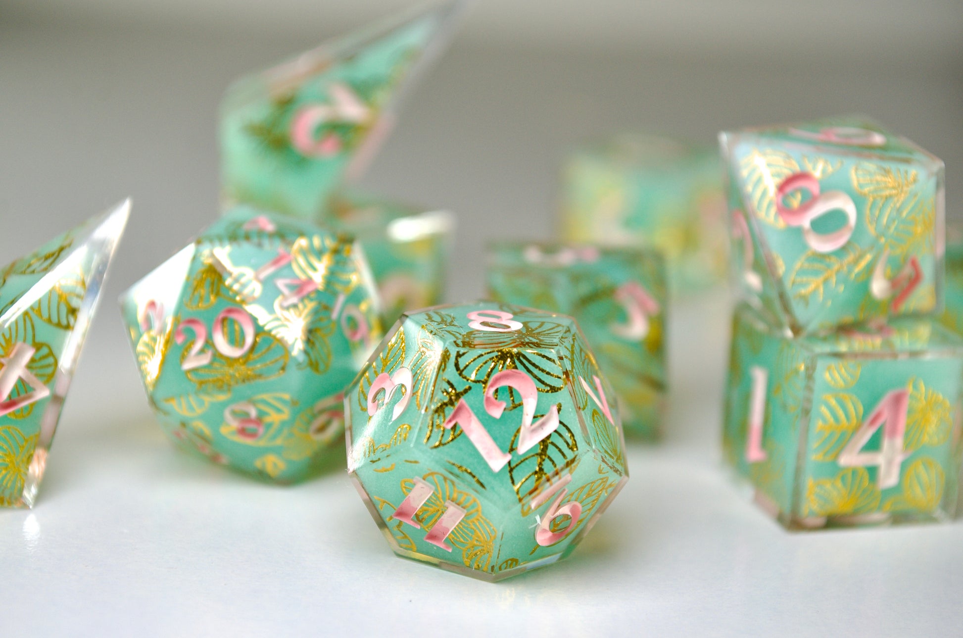 There is so much care and attention to detail in the way these dice have been poured to the high shine polish. Absolutely adore the florals and the bright, vibrant green! Looking forward to picking up another set!