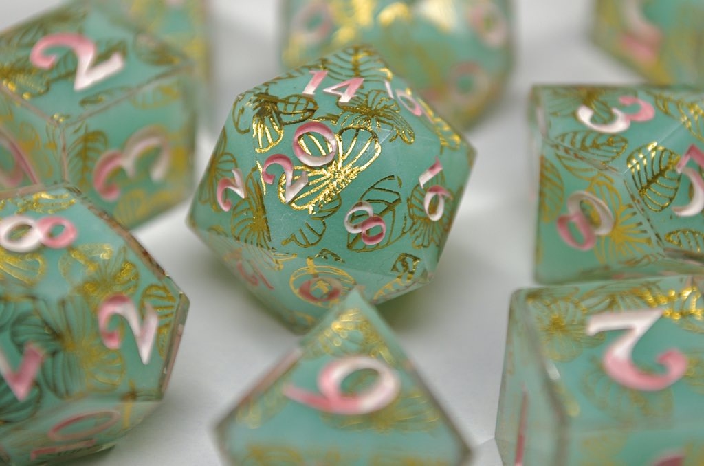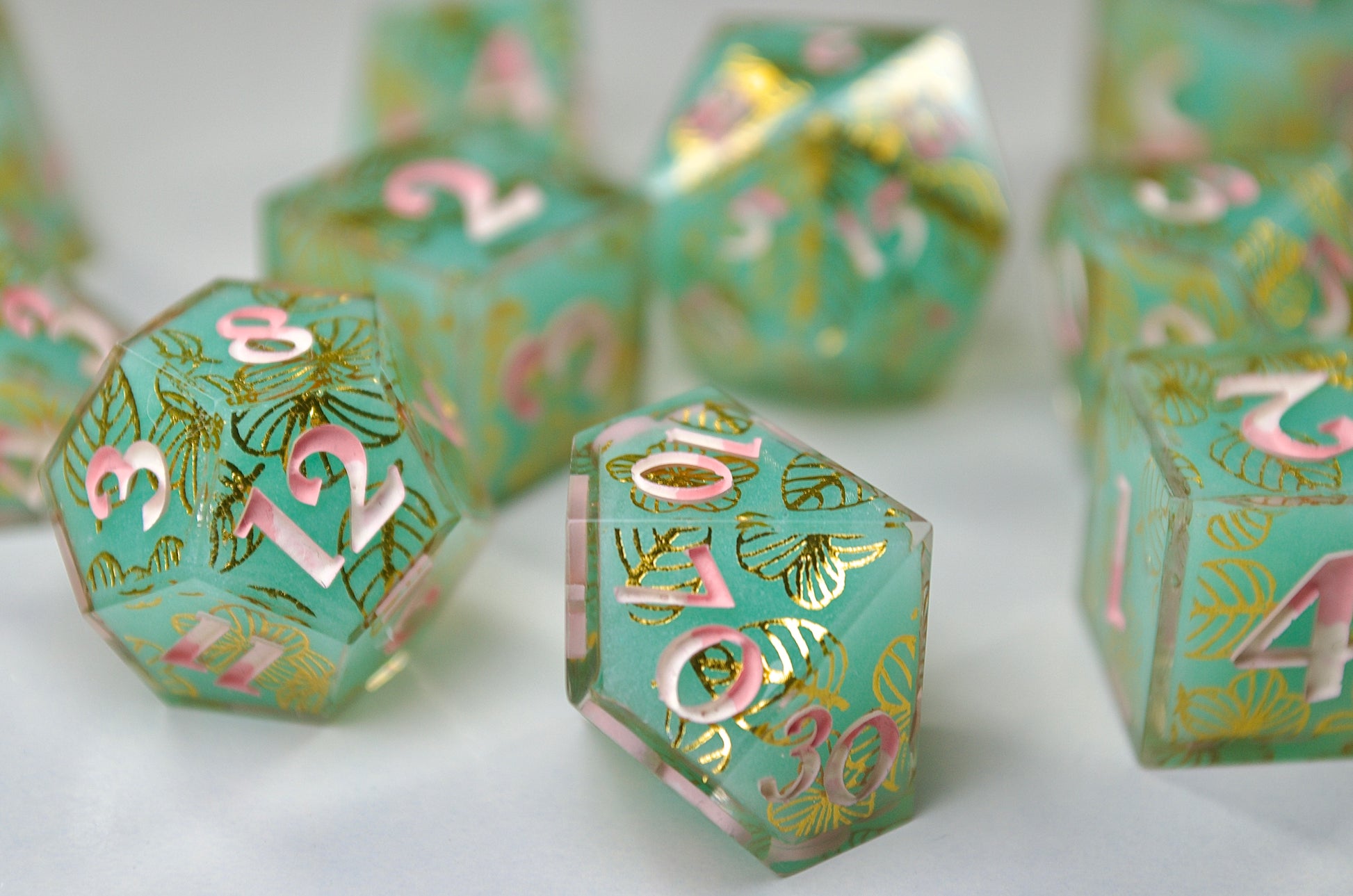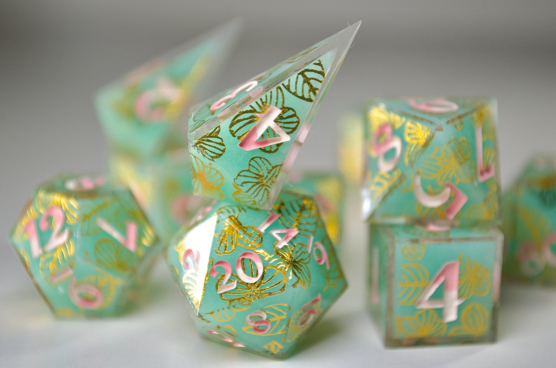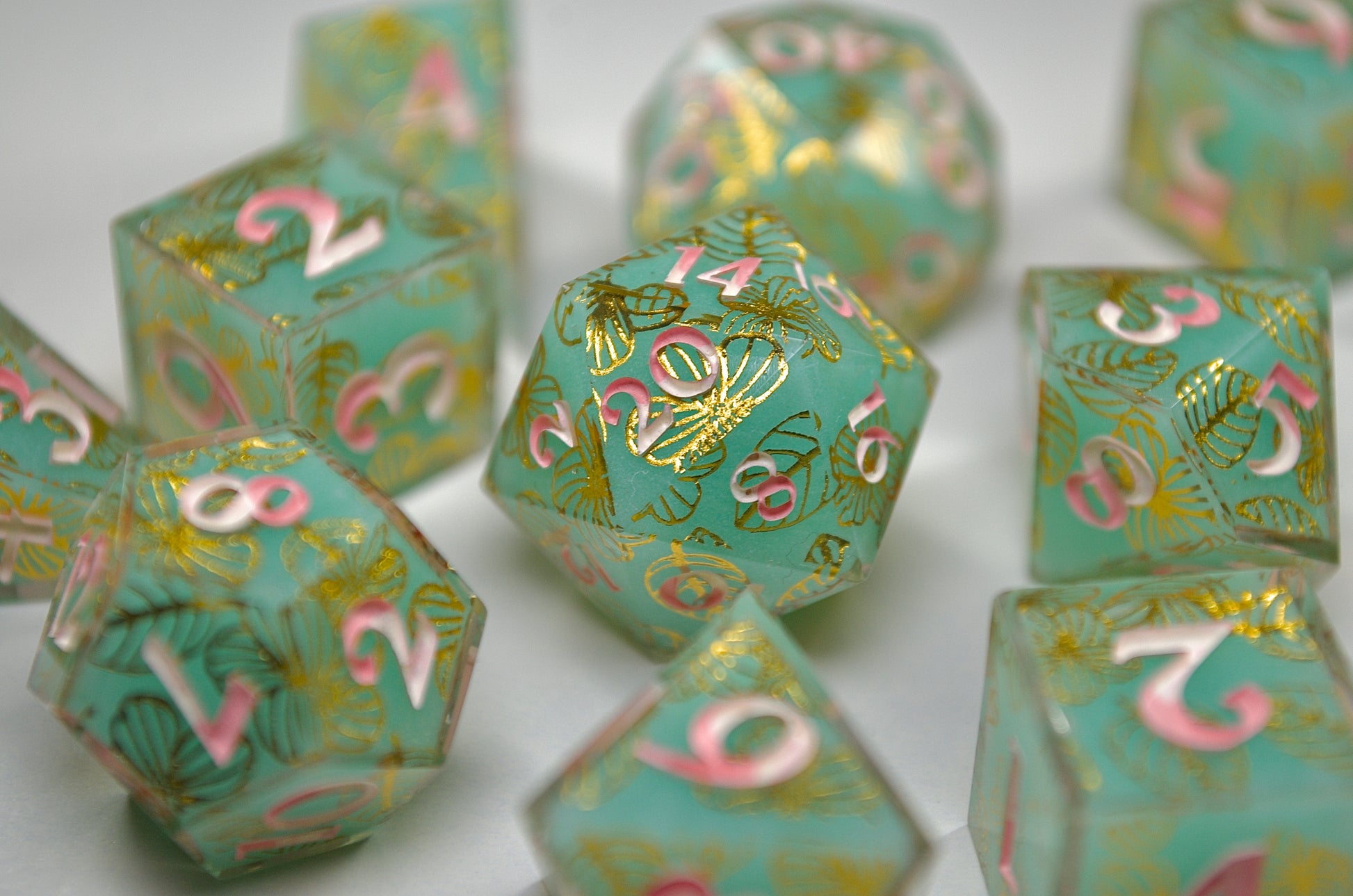 There is so much care and attention to detail in the way these dice have been poured to the high shine polish. Absolutely adore the florals and the bright, vibrant green! Looking forward to picking up another set!