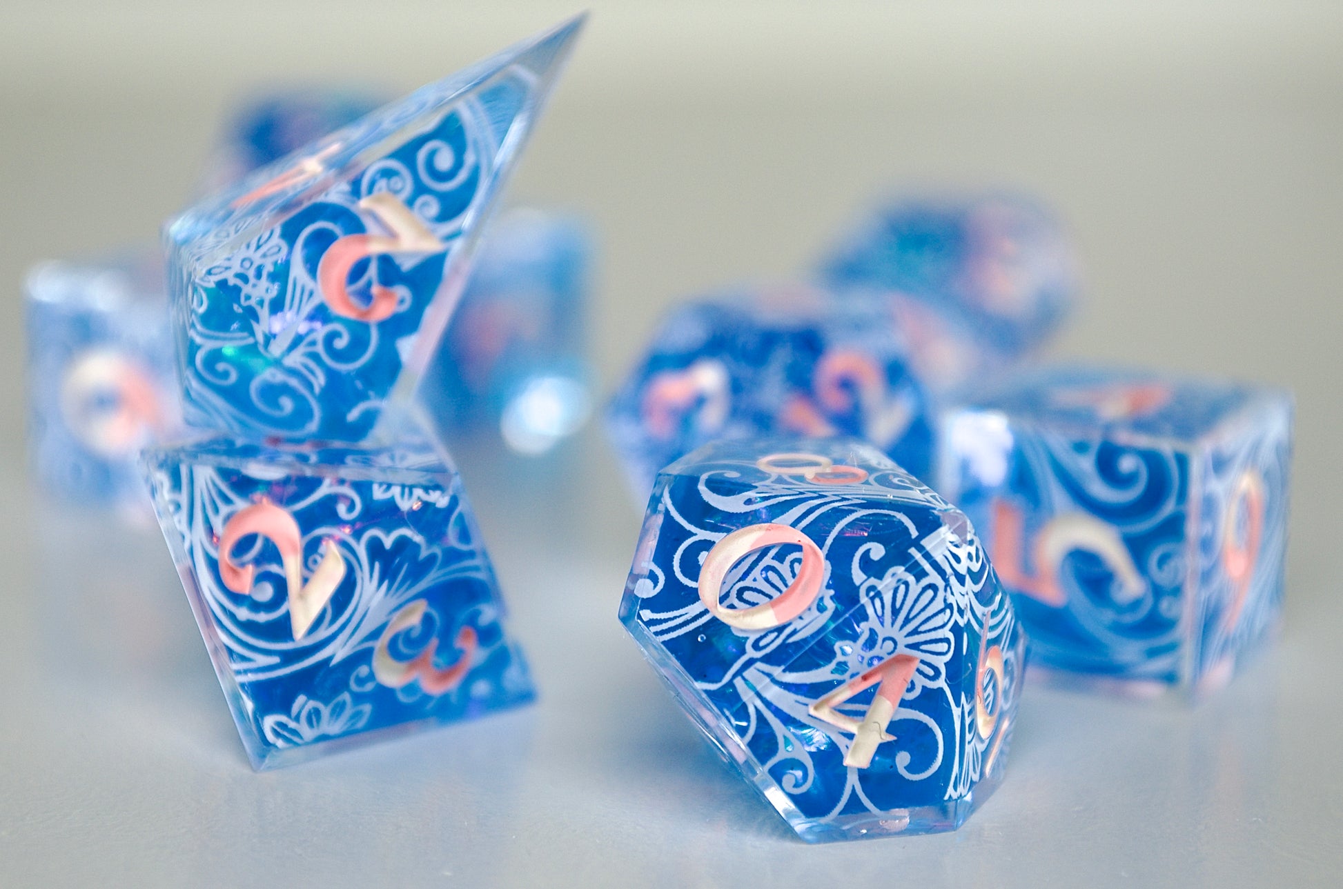 There is so much care and attention to detail in the way these dice have been poured to the high shine polish. Absolutely adore the florals and the bright, vibrant green! Looking forward to picking up another set!