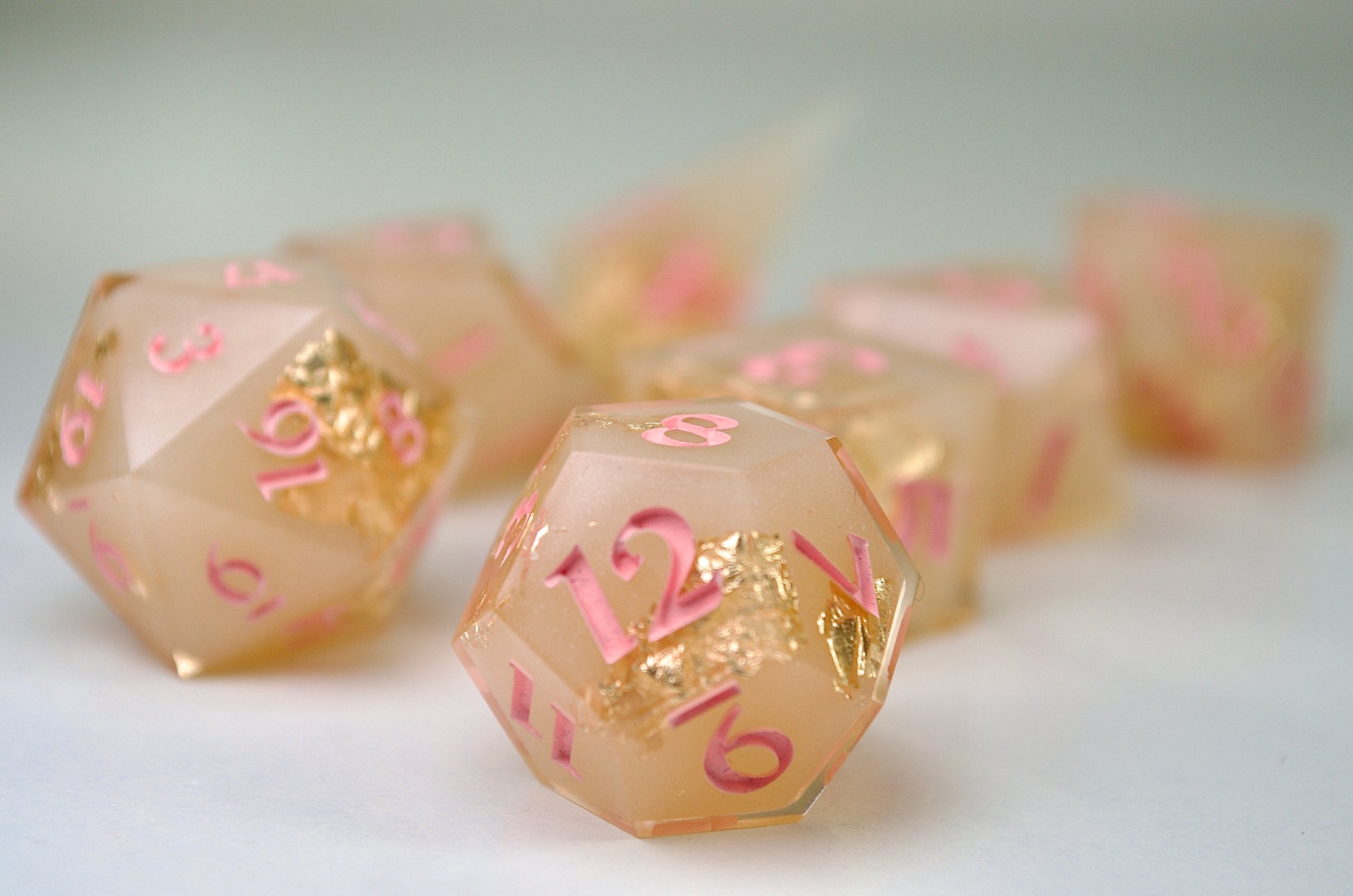 Opaque off-white cores with gold foil and pink numbers. This 9-piece dice set comes with a D20, D%, D12, D10, D8, 2D6, 2D4, a bonus die, and a velvet drawstring pouch.